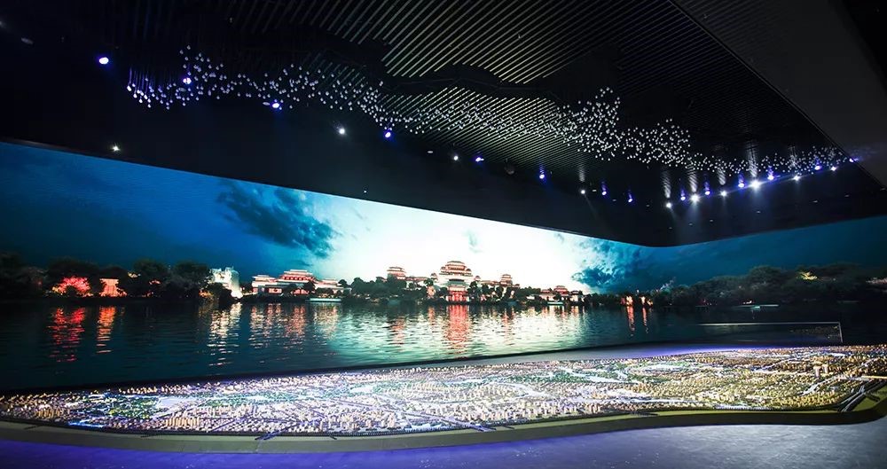 主题展厅中现代厅主要讲述整个汉中城市依靠汉水,孕育、延伸、拓展到现在新的城市规划、文化脉络。高清LED巨屏、裸眼3D观影效果、兴汉新区27.7平方公里的可升降规划沙盘,在高科技手段支持下,共同呈现出兴汉新区天上银河地上汉水的千古梦境。