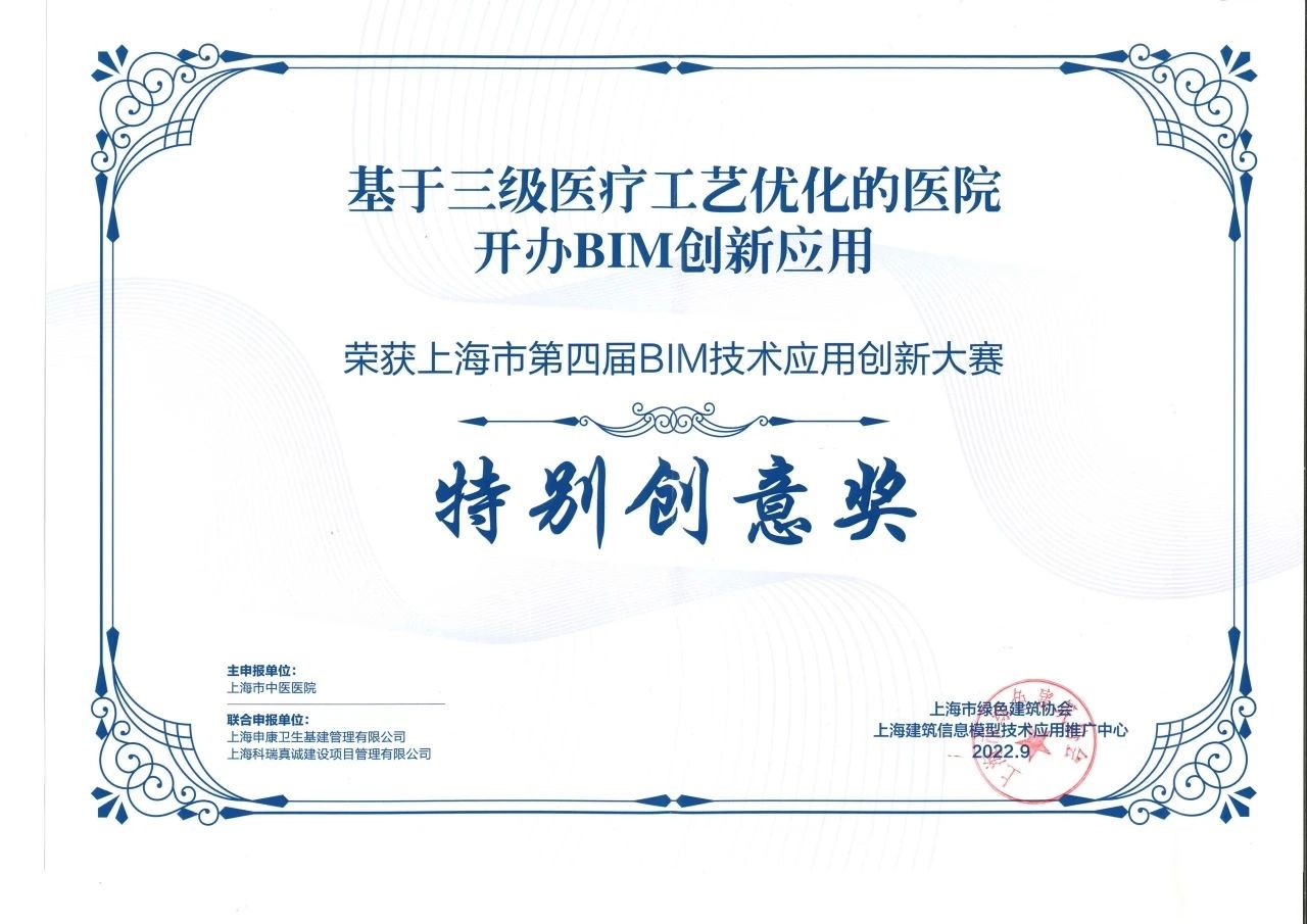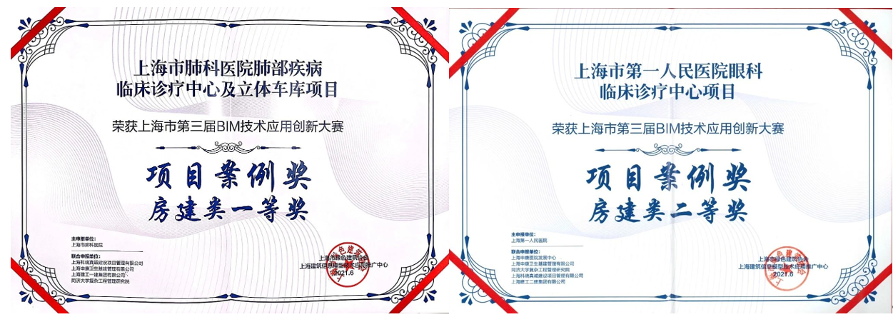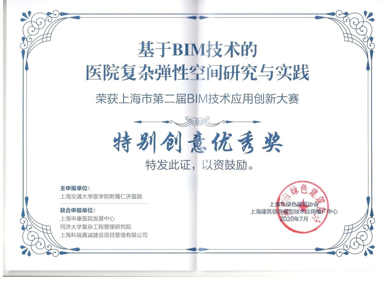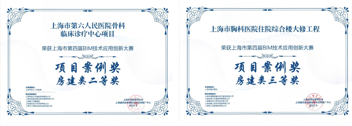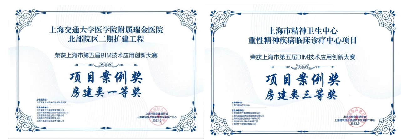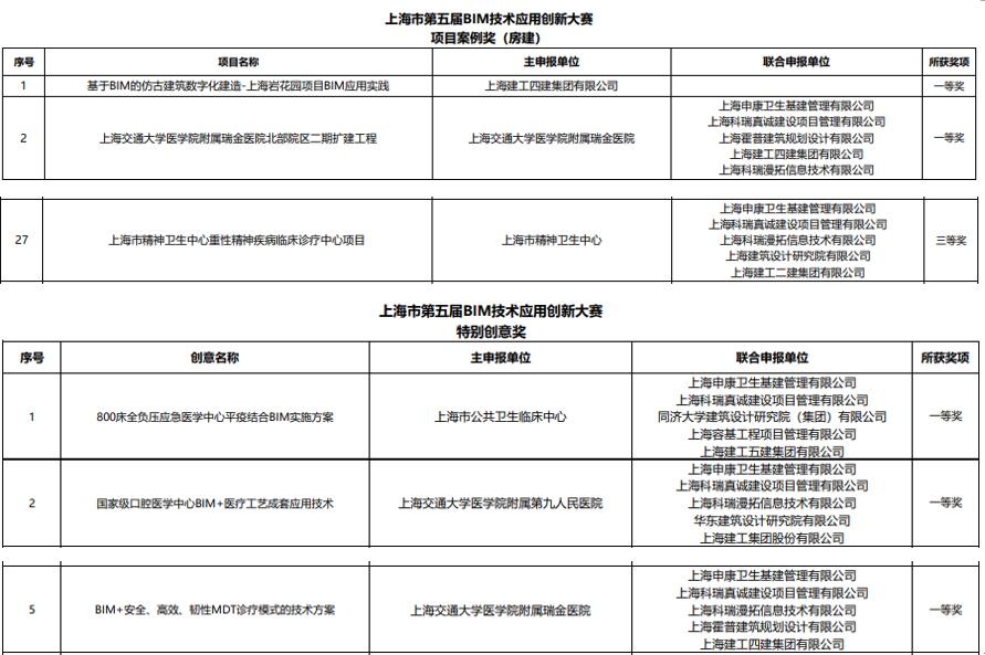 由上海市住房和城乡建设管理委员会、上海市绿色建筑协会、上海建筑信息模型技术应用推广中心共同举办的上海市第五届BIM技术应用创新大赛经过多轮评审,最终产生项目案例奖99项、特别创意奖24项、优秀个人奖30项。我司BIM团队联合申报项目上海交通大学医学院附属瑞金医院北部院区二期扩建工程、上海市精神卫生中心重性精神疾病临床诊疗中心项目分别斩获房项目案例奖房建类一等奖、三等奖。800床全负压应急医学中心平疫结合BIM实施方案、国家级口腔医学中心BIM+医疗工艺成套应用技术和BIM+安全、高效、韧性MDT诊疗模式的技术方案获特别创意奖一等奖。