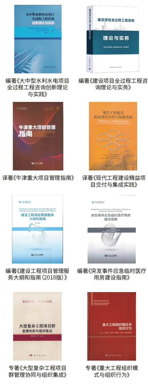 主持编写了一系列专著、译著、标准与指南,如《重大工程组织模式与组织行为》《巨型项目管理:雄心与风险》《牛津重大项目管理指南》《再造建筑:如何用制造业的方法改造建筑业》《建设工程项目管理服务大纲和指南》,为推动项目管理与工程管理行业发展作出努力与贡献。