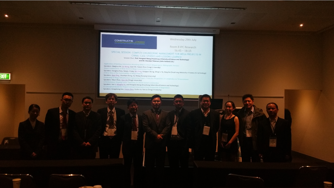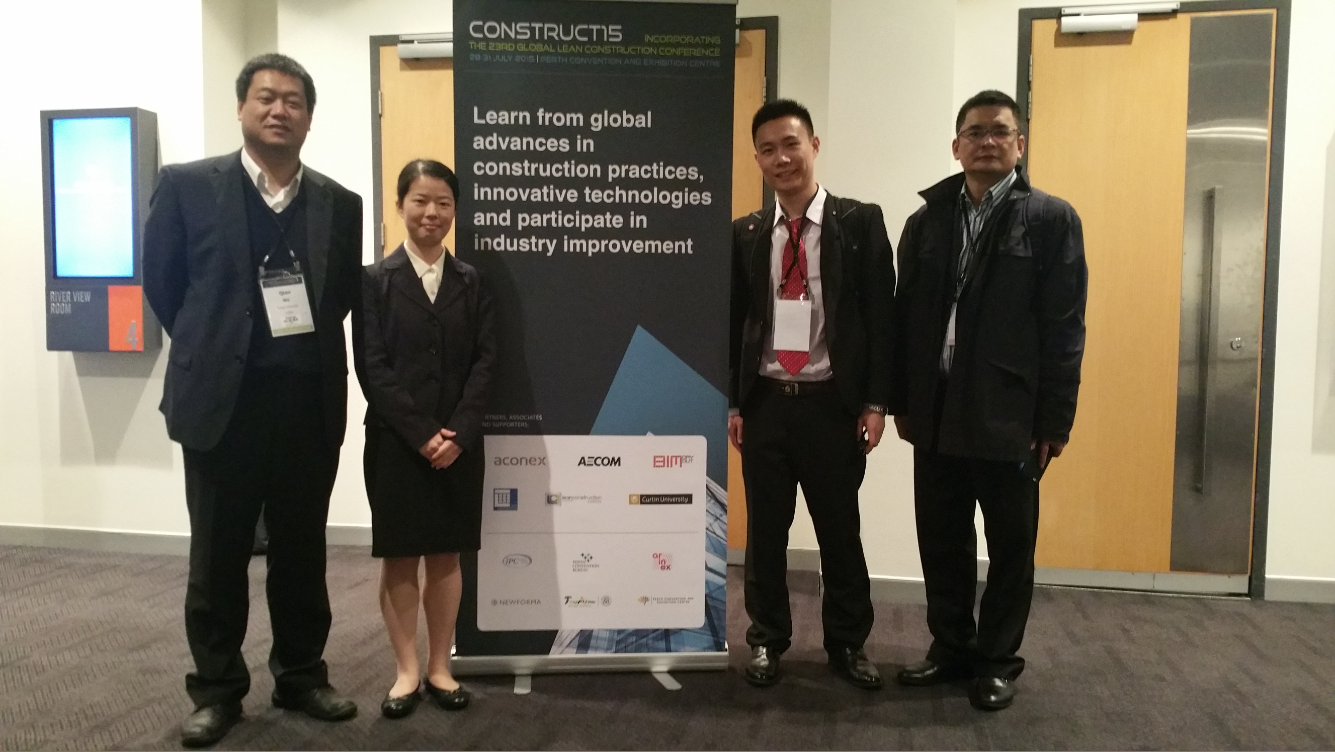 受澳大利亚科廷大学的邀请,2015年7月28日至8月2日,复杂工程管理研究院何清华教授、建设管理与房地产系施骞教授、博士研究生王歌和硕士研究生周雅娴赴澳大利亚Perth参加了Construct15 (Incorporating the 23rd Global Lean Construction Conference)国际会议,并在重大工程专题会议中分别以中国重大工程BIM应用(Application of Building Information Modeling in China’s Megaprojects: Bibliographic Analysis)、重大工程领导力(Leadership in Mega infrastructure Engineering project: From the Perspective of Compulsory and Temporariness)以及工程合同治理(A Conceptual Model for Project Contract Governance From Perspective of Negotiation)为主题做了专题演讲。