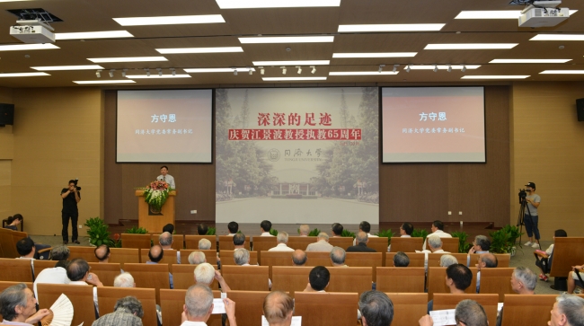 7月23日,由经济与管理学院承办的“深深的足迹——庆贺江景波教授执教65周年”座谈会在同济大学建筑设计研究院报告厅举行。江西省政协主席黄跃金,中共上海市委常委、统战部部长沙海林,民盟中央副主席、上海市人大常委会副主任、民盟上海市委主委郑惠强,上海市政协秘书长贝晓曦,上海市委统战部副部长虞丽娟,杨贤金、裴钢、伍江、方守恩、马锦明、顾祥林等校领导,汪品先院士、沈祖炎院士、郑时龄院士、常青院士等著名专家,江景波教授的老同事、学生和经济与管理学院师生代表等共同出席了座谈会。全国政协副主席、科学技术部部长万钢、原教育部副部长吴启迪、民盟中央、上海市政协、清华大学建设管理系、哈尔滨工业大学管理学院和天津大学管理与经济学部等领导或单位发来贺信,向江景波教授表示祝贺和祝福。座谈会由校党委常务副书记方守恩主持。