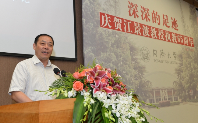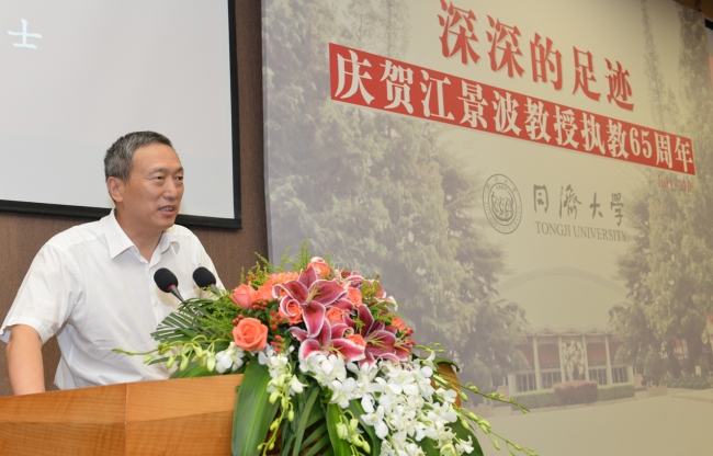 校党委书记杨贤金发表讲话,高度评价了江景波教授的睿智思想和人格风范。他认为江景波教授既是教书育人、桃李满园的模范教师,也是引领工程管理学科发展的卓越学者,更是在同济师生中具有巨大感召力、拥有良好口碑的教育专家。江景波教授的经历十分丰富,他的治校办学思想也是同济人宝贵的精神财富,值得我们认真研究学习,并从中汲取继续前行的力量。江景波校长是一位具有远见卓识的教育家,是一位具有高超领导艺术和极强敬业精神的大学管理者,是一位具有强烈创新精神的科学家和学科带头人。杨贤金希望全校师生通过这次庆祝活动,能够更好地学习继承江校长的治学思想、敬业精神和创新意识,让学术薪火在一代代同济人身上传承。
