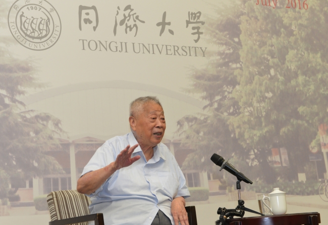 座谈会的最后,江景波教授上台致辞。尽管已入耄耋之年,江景波教授仍思维活跃、思路清晰。他回顾了自己的成长历程和在同济大学任教65年的经历,以四个字谦逊地评价自己:“卖力、不贪”。他表示,自己从艰苦岁月一路走来,深感当前社会来之不易,惟有继续尽其所能,回报社会与他人,才能不辜负这个伟大的时代。江景波教授的发言赢得了现场最热烈的掌声。