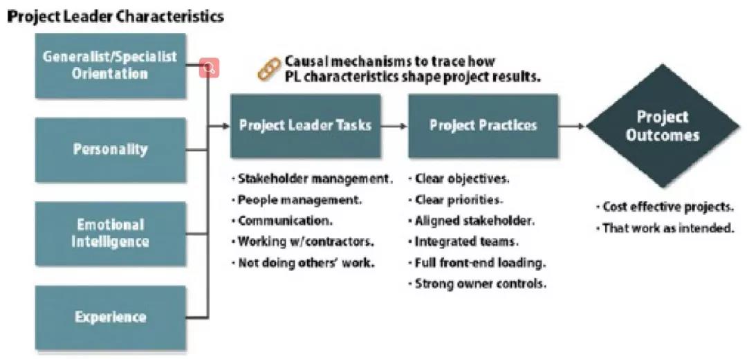 研究发现,和失败的项目领导相比,成功的重大工程领导体现出显著不同的个性和背景,但失败的项目领导和绝大数简单项目经理特征非常相像。成功的项目领导通常是通才,尽管他们职业生涯的早期是高水平的技术专家;他们具有非同寻常的开放的个性和高情商;他们早期具有丰富的职业生涯经历,他们甚至之前在不同公司和不同行业工作过。通过分析他们的早期职业生涯发现,他们都在项目前期工作具有不错的表现。另外,如果之前在NOV(Nonoperated Venture)企业工作过,这对他们担任重大工程领导具有很好的支撑。这一工作性质是:花钱让别人做事情而不是自己亲自做。