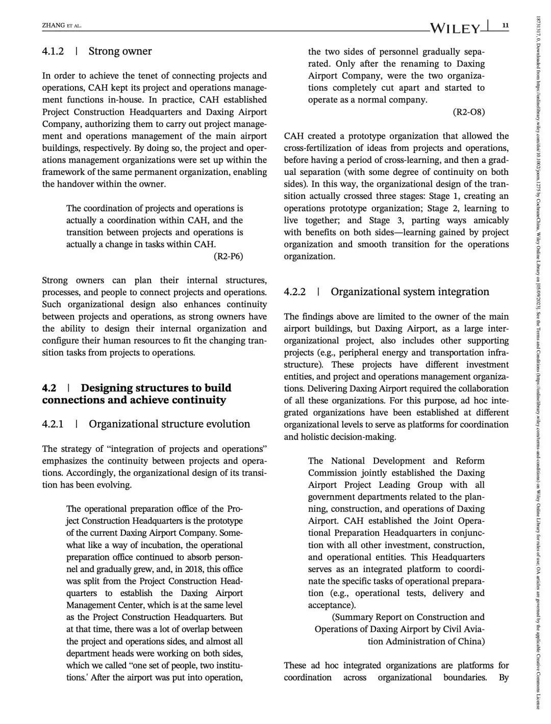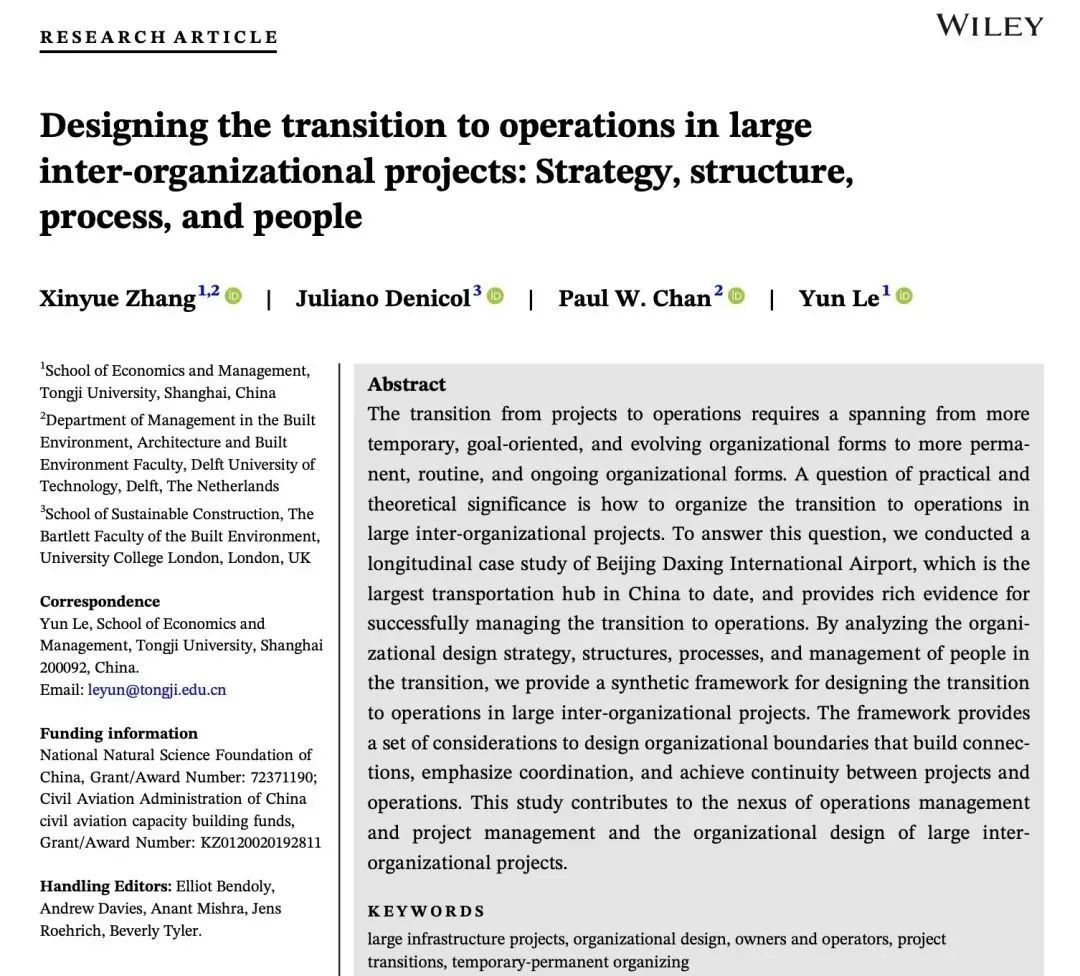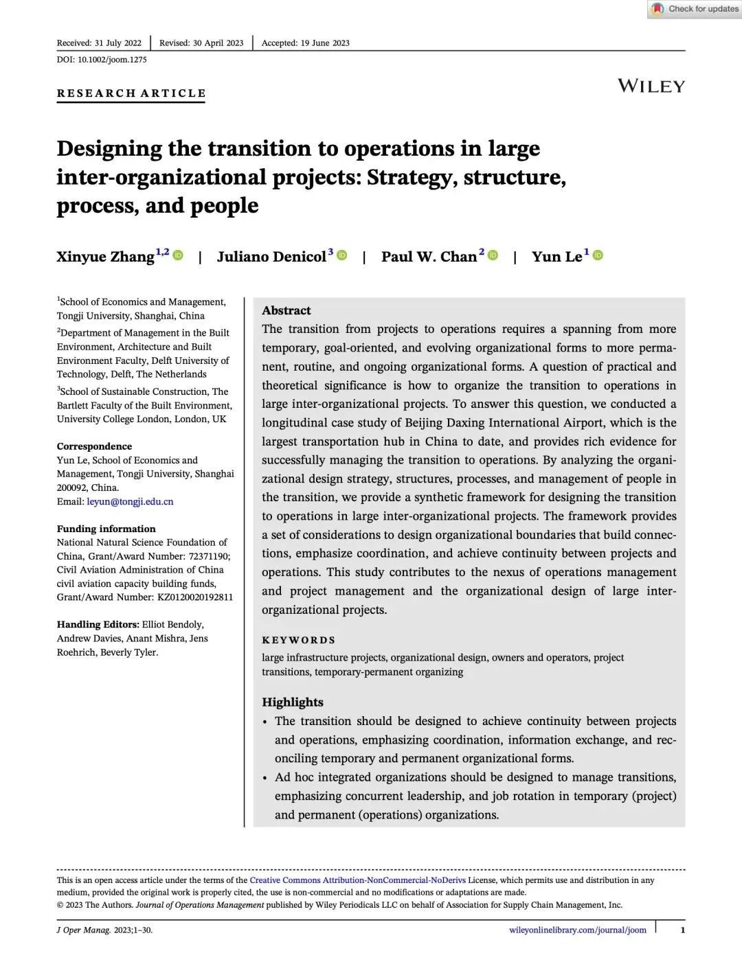 近日,同济大学复杂工程管理研究院在读博士研究生张馨月作为第一作者,乐云教授作为通讯作者的文章“Designing the transition to operations in large inter-organizational projects: Strategy, structure, process, and people”(设计大型跨组织项目向运营的过渡:战略、结构、过程和人员)被管理学领域国际顶级期刊 Journal of Operations Management(UTD 24)录用并发表。