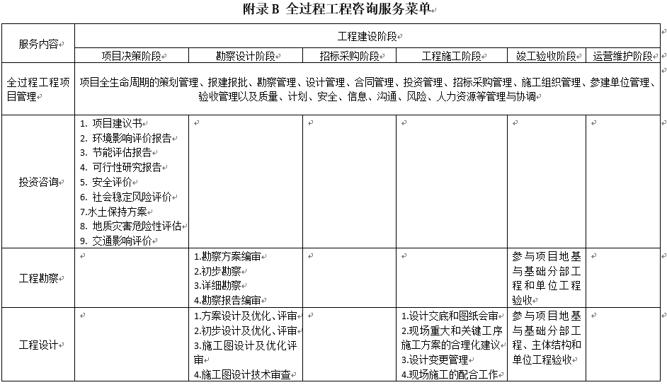 3.1.3 全过程工程咨询单位可根据投资人的委托,独立承担项目全过程全部专业咨询服务,全面整合项目建设过程中所需的投资咨询、勘察、设计、造价咨询、招标代理、监理、运营维护咨询以及全过程工程项目管理等咨询服务业务;也可提供菜单式服务,即“1+N”模式,“1”是指全过程工程项目管理(必选项),“N”包括但不限于:投资咨询、勘察、设计、造价咨询、招标代理、监理、运营维护咨询等专业咨询(可选项),可参考附录B《全过程工程咨询服务菜单》