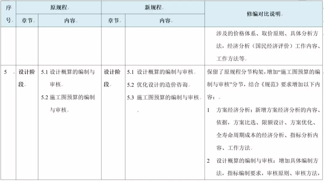 �解读:第2章术语中,对于全过程造价咨询、全方位造价控制明确了具体解释。强调以工程造价管理为核心、合同管理为手段,对建设项目各个阶段、各个环节进行计价,建立由设计、施工、监理等各方参与的造价确定与协同管控机制。对应新规程各阶段的内容新增“合同管理、招标策划、价值工程、限额设计、设计方案经济比选、全寿命周期成本、期中结算”等新规程着重描写的内容。