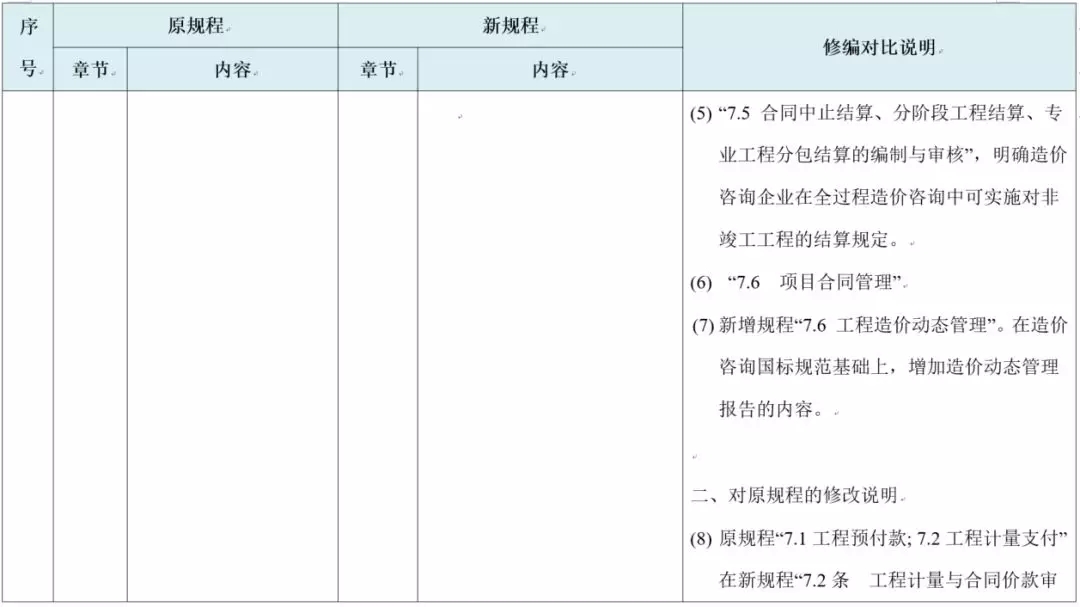 新规程在已实施的《建设工程造价咨询规范》(国家标准GB/T 51095-2015)规范下,对比原规程进行修编,突出可操作性,具体化实施内容和要求,可用于检查、评判造价咨询成果,规范造价咨询行为,编制要点如下: