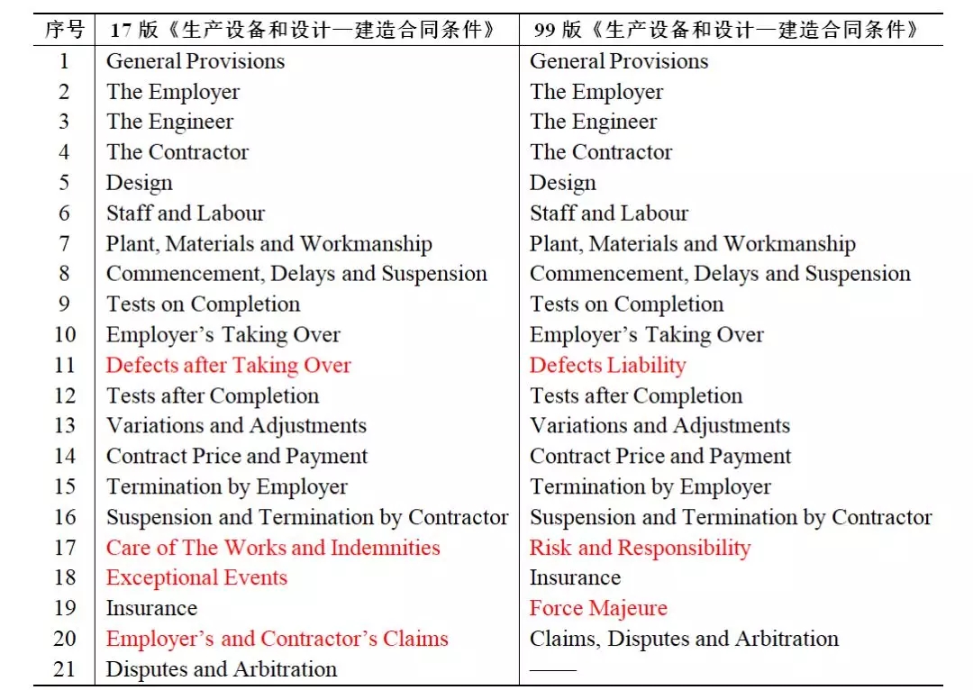 17版三本合同条件都将99版的第11条“缺陷责任”改为了“接收后的缺陷”;将第17条“风险与职责”改为了“工程照管与保障”;第18条与第19条调换了顺序,“不可抗力”被重新命名为“例外事件”;将99版的第20条“索赔、争端与仲裁”,拆分成了第20条“业主和承包商的索赔”和第21条“争端和仲裁”。