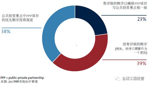 在39%的经济体中,相比其他公共投资项目优先考虑PPP项目是原则上要求并在实践中采用的,但是这些规定并没有详细说明具体应遵循的流程,而是由采购部门酌情决定实施。例如,在巴基斯坦,包括计划委员会在内的部门,将对巴基斯坦PPP项目进行筛选和评估,“确保与巴基斯坦政府的基础设施政策/战略保持一致”。在其余38%的经济体中,公共投资重点中PPP项目的优先顺序没有规定,这些经济体如何确保PPP项目和更广泛的投资计划优先项目的一致性尚不明确。